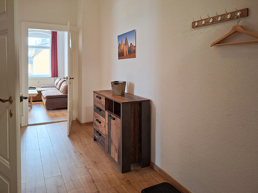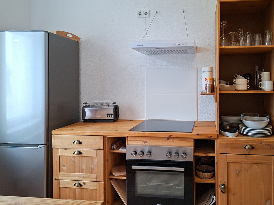 Die 50m² große Ferienwohnung ist perfekt für 3 Personen geeignet. Die Küche ist ausgestattet mit Herd, Backofen, Kühl-/Gefrierkombi, Kaffeemaschine, Wasserkocher und Toaster. Im Wohnzimmer mit TV befindet sich ein Schlafsofa für eine weitere Person. Im Schlafzimmer Richtung Westen gibt ein Doppelbett und ein Einzelbett. Im Eingangsbereich sind genügend Abstellmöglichkeiten. Im Bad befindet sich eine Dusche und WC.