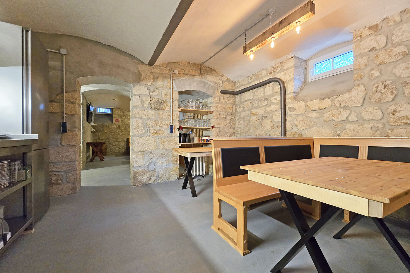 Der separate Veranstaltungsraum für Gruppen bis 16 Personen ist über eine verschließbare Tür im Untergeschoss des Haus Felsenpost zugänglich. Der Zugang wird per Schlüsselcode gewährt. Dieser wird bei Buchung per E-Mail mitgeteilt. Über einen kleinen Flur sind 2 Räume miteinander verbunden. Ein Raum enthält eine Küchenzeile mit Kühlschrank, Gefriereinheit, Spüle, Kaffeemaschine, Toaster, 2 Herdplatten und Geschirrspüler samt ausreichend Geschirr für die maximale Platzkapazität. Im zweiten Raum ist neben Sitzbänken und Tischen zusätzlich ein TV mit WiFi-Verbindung an der Wand. Ein Gemeinschafts-WC ist außerhalb des Gruppenbereichs nutzbar. Dieses ist auch für Sauna-Gäste zugänglich. Für den Gruppenraum wird eine Kaution erhoben. Er ist prinzipiell besenrein zurückzugeben und so zu hinterlassen, wie Sie ihn vorfinden. Es darf kein Geschirr aus den Wohnungen mit in den Gruppenraum genommen werden. Der Geschirrspüler ist nach Benutzen auszuräumen und der Raum muss wieder verschlossen werden (Schlüssel in Schlüsselbox).