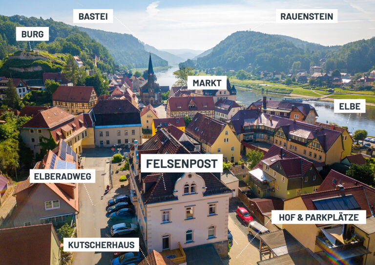 Der Ortsteil Stadt Wehlen liegt direkt an der Elbe. Dabei passieren Sie den Ortsteil Dorf Wehlen. Wenn Sie in Stadt Wehlen bergab eingefahren sind, durchqueren Sie ein markantes Haus, welches über die Straße gebaut ist. Danach biegen Sie direkt rechts ab und sehen schon auf der linken Seite das Haus Felsenpost. Die Einfahrt in den Hof befindet sich links vom Haus.